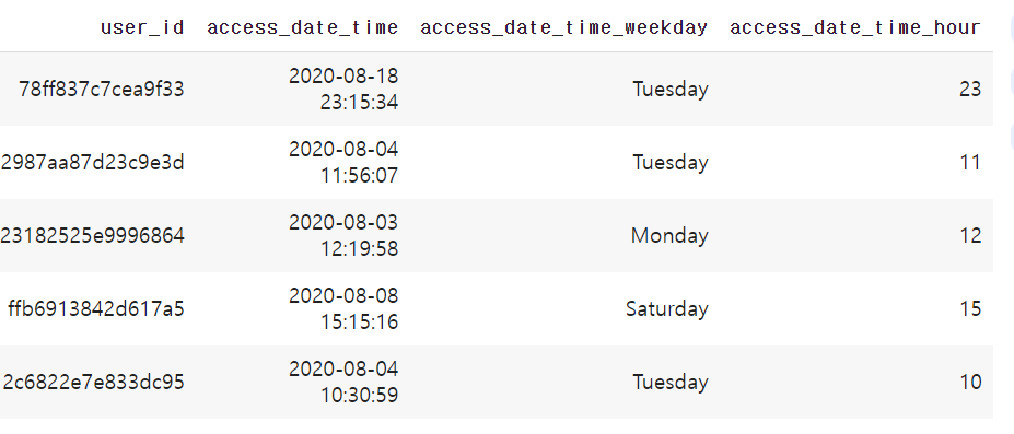 2) 시간 데이터 전처리 해주기 기존의 sparta_data에 있는 컬럼들은 다음과 같습니다. access_date 컬럼을 이용하여 access_date_time 컬럼 만들기 a = '%Y-%m-%dT%H:%M:%S.%f' # a라는 변수에 '%Y-%m-%dT%H:%M:%S.%f'라는