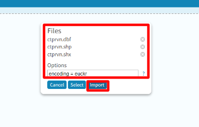 (1) 변환된 파일 3개를 넣고 option에 encoding=euckr(띄어쓰기 없어야함.) 라고 입력하고 import 클릭