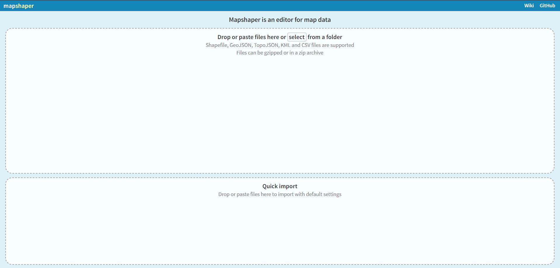 Drop or paste files here or select from a folder Shapefile, GeoJSON, TopoJSON, KML and CSV files are supported Files can be gzipped or in a zip archive Quick import Drop or paste files here to import with default settings