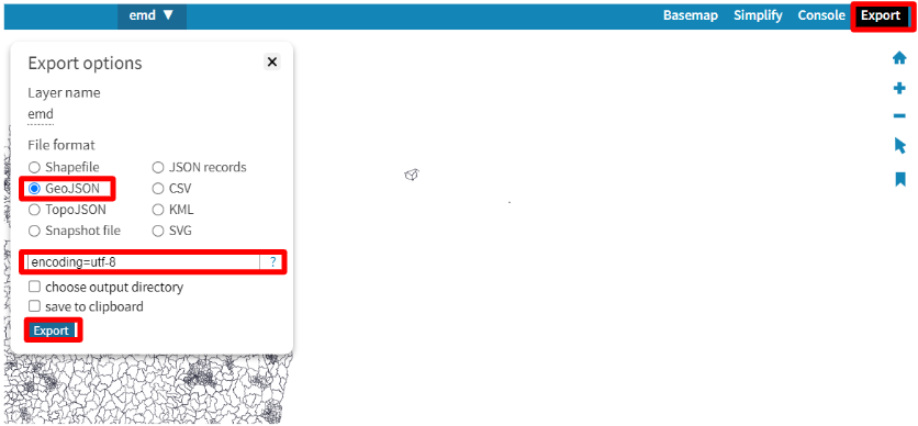 (2) 오른쪽 상단 'Export' 버튼을 누르고 GeoJSON 선택 후 option에 encoding=utf-8(띄어쓰기 없어야함.) 라고 입력하고 ㄷExport 클릭