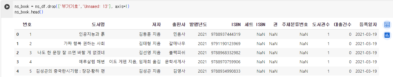 # ns_df라는 데이터프레임에서 '부가기호', 'Unnamed: 13'라는 컬럼을 없앨거고 ns_book이라고 할거야!