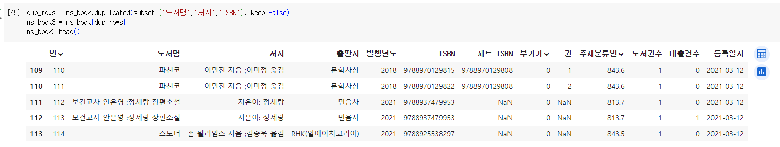 dup_rows = ns_book.duplicated(subset=['도서명','저자','ISBN'], keep=False)